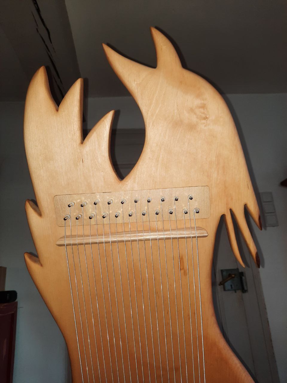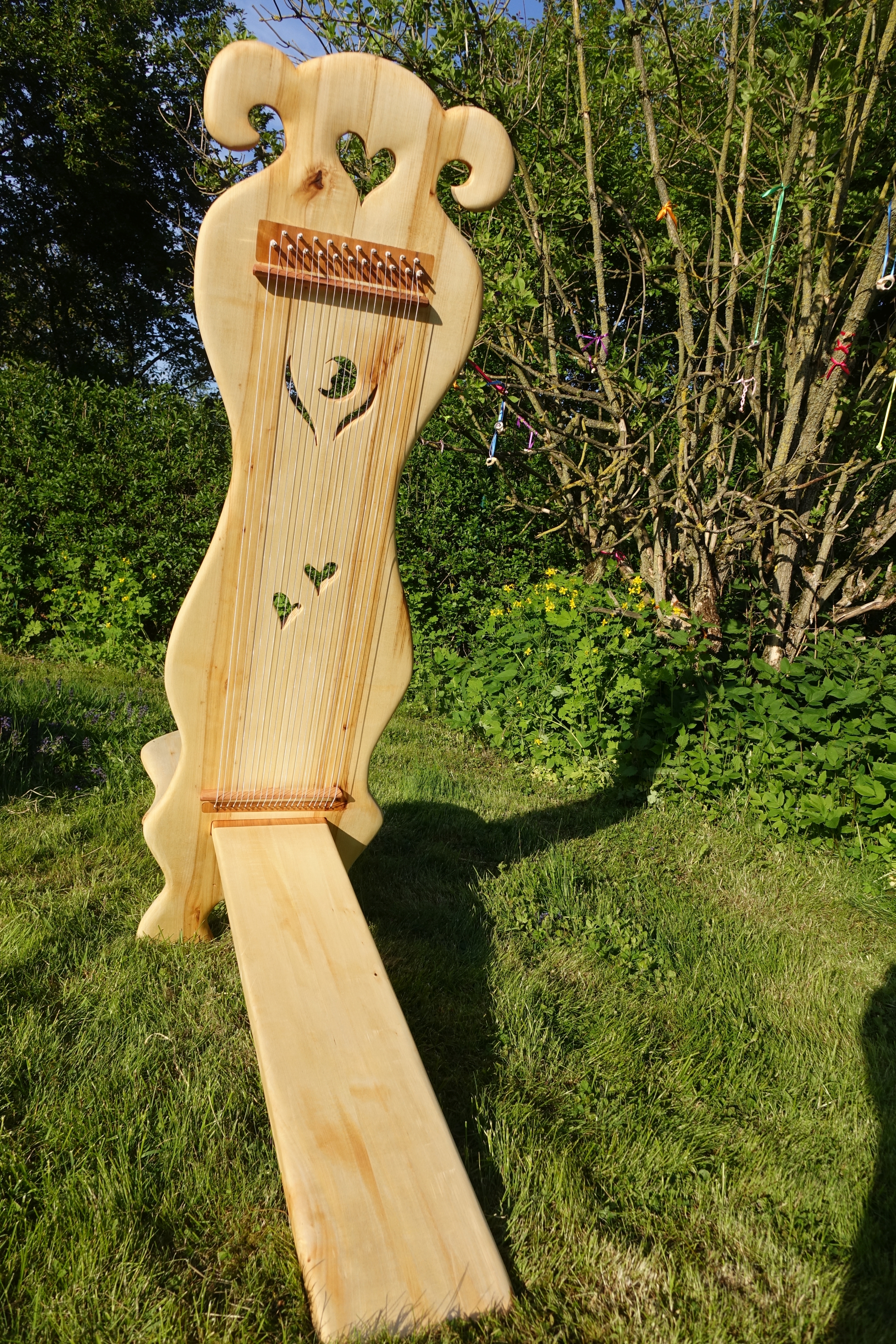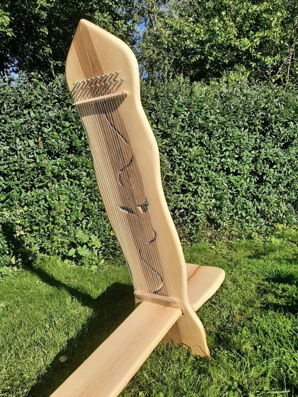 Ein Klangstuhl ist mit 21 Saiten bespannt und schwingt in zwei Oktaven.