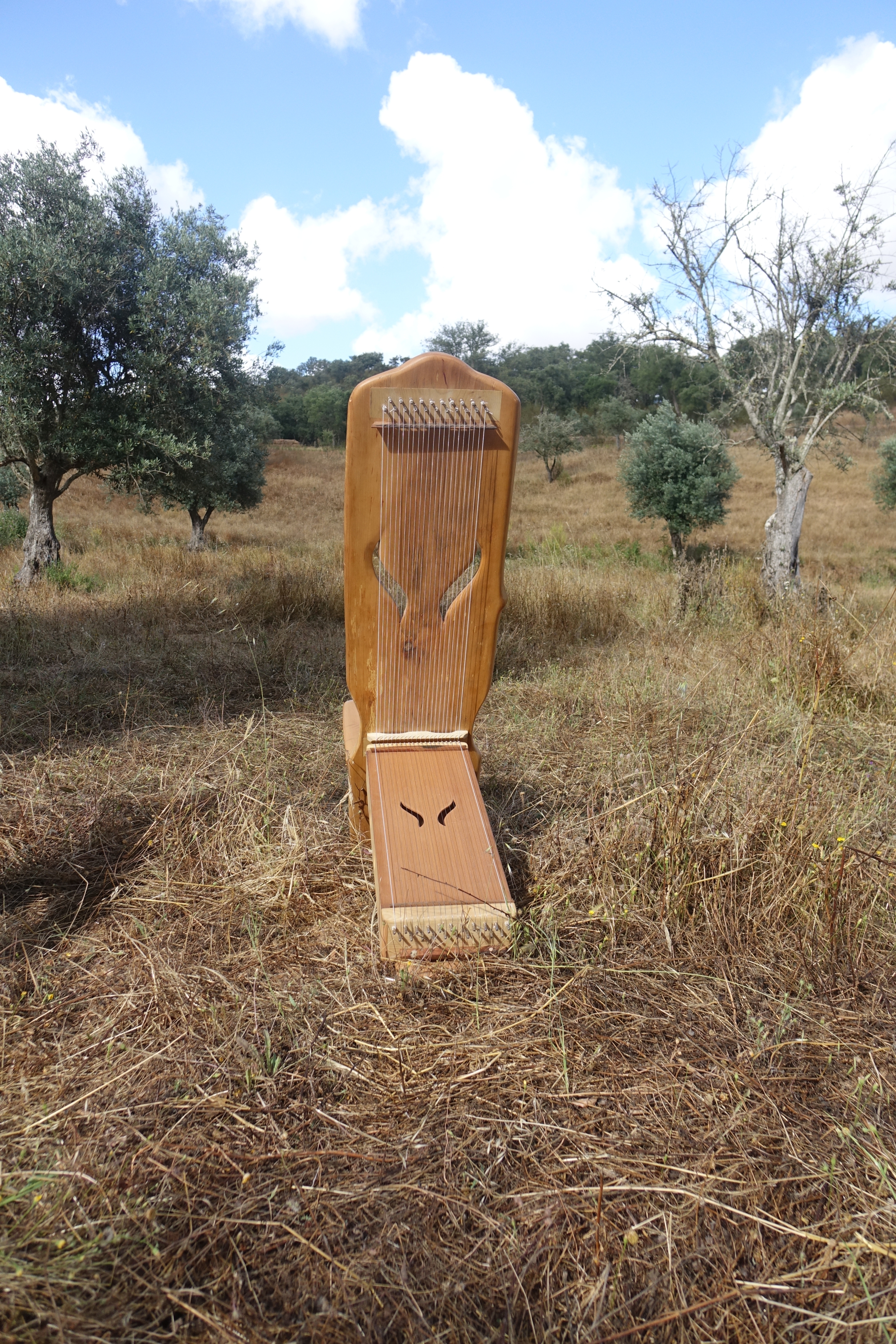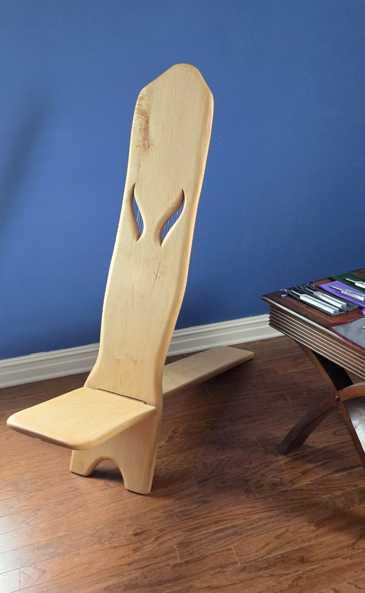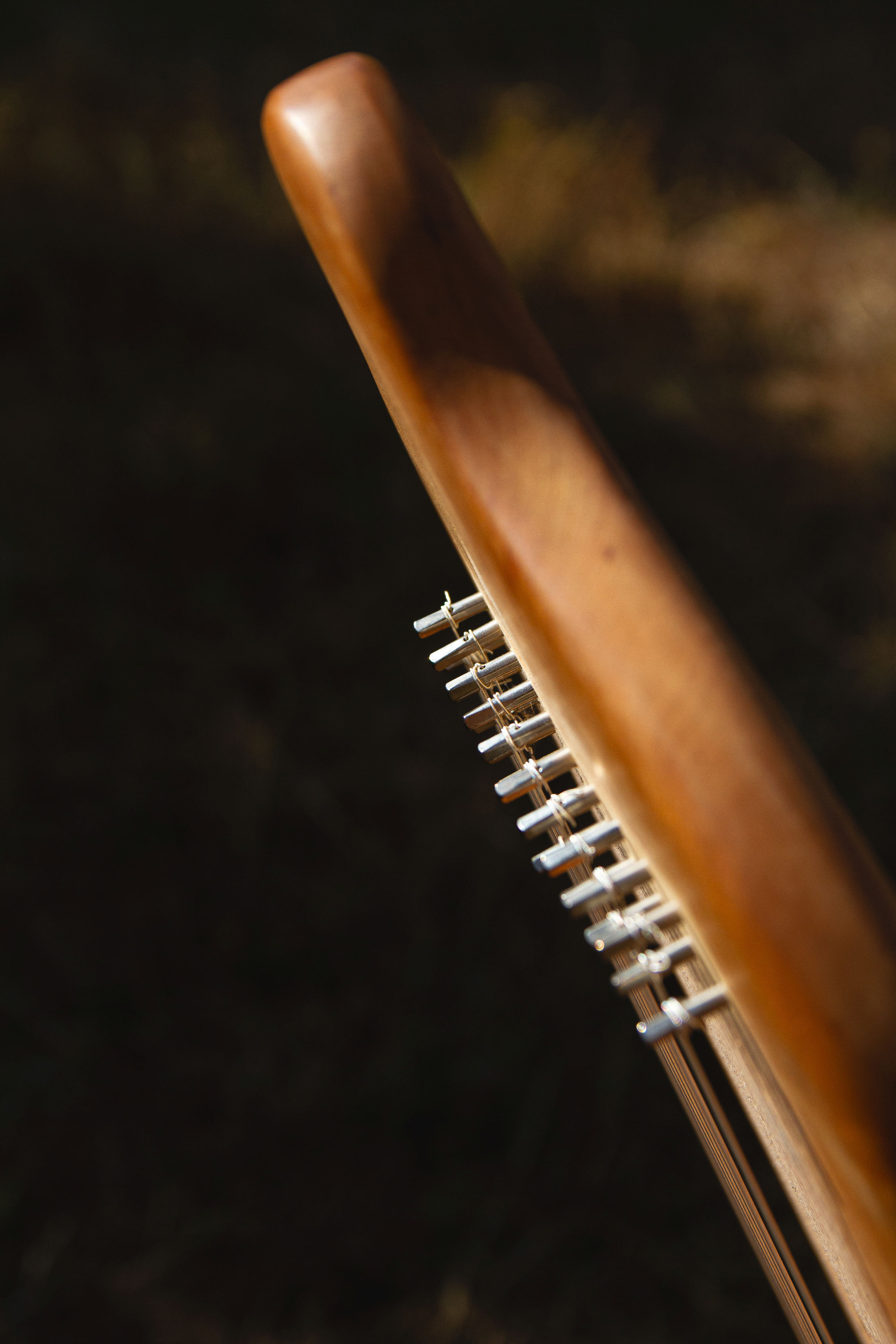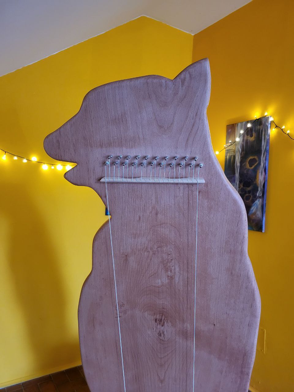 Ein Klangstuhl ist mit 21 Saiten bespannt und schwingt in zwei Oktaven.